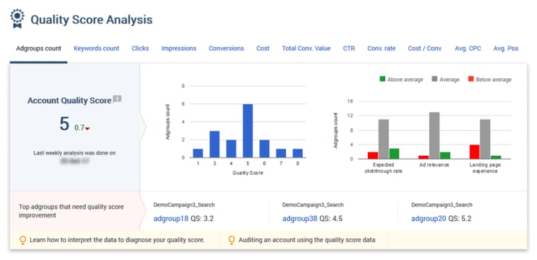 Инструмент оценки качества Adalysis также предоставляет данные на уровне аккаунта, кампании и группы объявлений для более быстрого понимания. Он не предлагает рекомендаций, вместо этого позволяя вам самостоятельно интерпретировать данные и делать свой собственный выбор. Это может понравиться одним рекламодателям больше, чем другим, так что это просто дело опыта и личных предпочтений. По сравнению с Tenscore, доступные данные в основном одинаковы, и обе платформы ранжируют ваш QualityScore в порядке приоритетности (те, которые требуют вашего внимания больше всего). Интерфейс Tenscore немного проще для глаз, и он также показывает, как ваши баллы качества влияют на расходы на рекламу и бюджет. Для менее опытных рекламодателей Tenscore, вероятно, является лучшим вариантом, но это решение становится немного сложнее, если вы уверены в принятии решений на основе данных.