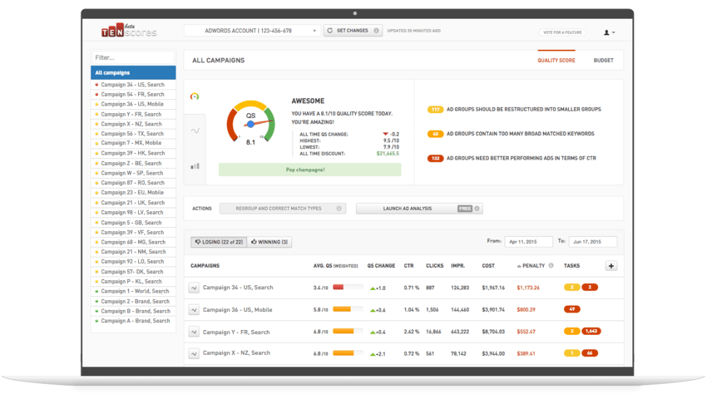 В отличие от Google Ads или WordStream, Tenscore – это настоящий инструмент оценки качества и ничего больше. В инструментах, которые мы рассматривали до сих пор, вы получаете данные Quality Score только на уровне ключевых слов, но Tenscore также предоставляет данные на уровне аккаунта, кампании и группы объявлений. Это гораздо более интуитивный способ доступа к данным, поскольку вы управляете своим аккаунтом на уровне кампании и группы объявлений, что значительно облегчает оценку эффективности и выявление проблем. Tenscore также предлагает рекомендации по улучшению низких показателей качества, выделяет группы объявлений с проблемами и отправляет вам уведомления по электронной почте в случае внезапного падения показателей. Вы также можете применить эти рекомендации в несколько кликов через приборную панель Tenscore без необходимости входа в Google Ads.
