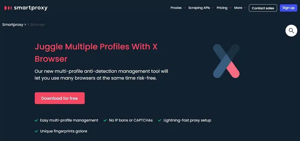 Smartproxy – это прокси-провайдер премиум-класса. Зная, насколько важны прокси для пользователей браузеров-антидетекторов и даже интернет-маркетологов в целом, мы включили его в эту статью. Если у вас есть активная подписка на Smartproxy, то вам не придется тратить дополнительные деньги на оплату браузера-антидетектора. Ведь для пользователей Smartproxy X-Browser является бесплатным. С его помощью вы можете создавать и управлять несколькими учетными записями, не получая при этом обнаружения. Мы рекомендуем использовать этот браузер, но только в том случае, если вы не являетесь активным пользователем.