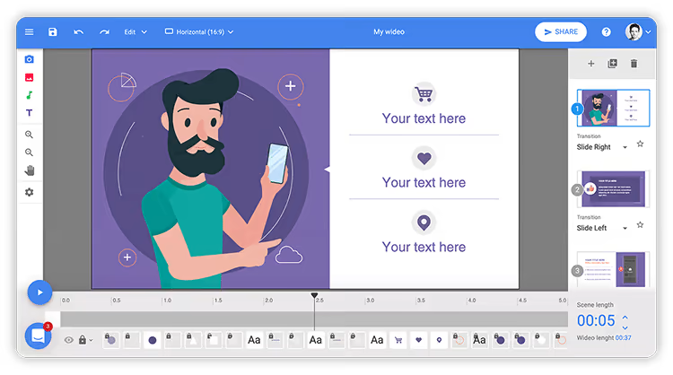 Wideo предлагает вам простой и быстрый путь преобразования текста в речь. Напишите сообщение прямо в поле или загрузите свой текстовый файл, выберите один из голосов, определите скорость и начните прослушивание. Wideo предоставляет лучший вариант загрузки голоса в формате mp3. Это БЕСПЛАТНОЕ и простое в использовании приложение полезно для создания объясняющего видео или демонстрационного видео, где вы можете добавить голос в видео с помощью этого инструмента преобразования текста в речь. Интеграция текста в речь Google осуществляется через Google API, но вам придется заплатить за количество используемых символов. Wideo интегрируется с технологией Google TTS и предлагает вам БЕСПЛАТНОЕ преобразование.