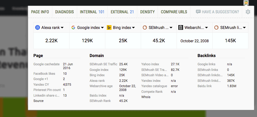 SEOquake – одно из самых скачиваемых SEO-расширений для браузера Mac, которое в настоящее время имеет более 3 миллионов загрузок. Одна из основных причин использовать SEOquake заключается в том, что он дает вам мгновенную SEO сводку для любой веб-страницы, включая информацию о странице, домене и обратных ссылках. Кроме того, он совершенно бесплатен в использовании!