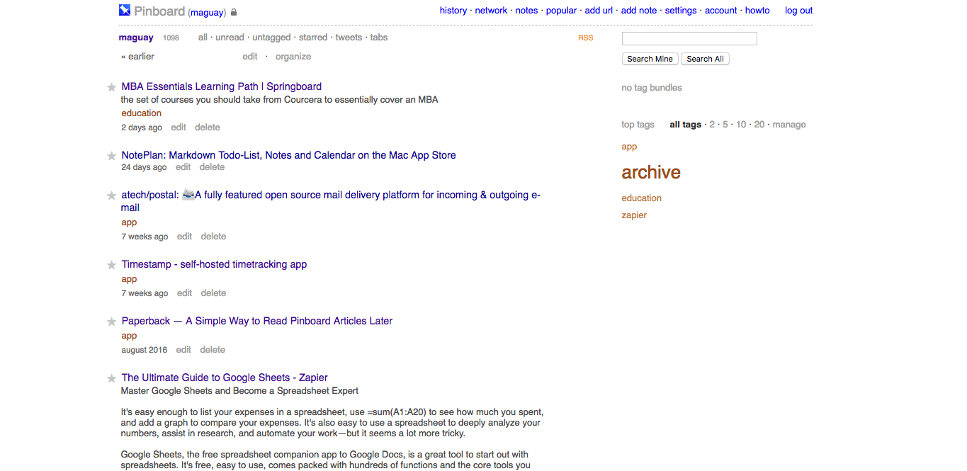 Дизайн Pinboard напоминает самые ранние веб-приложения с интерфейсом, насыщенным текстом (и удивительно быстро загружающимся). Он прост и понятен. Используйте его букмарклеты и интеграции приложений для создания закладок на сайты, добавляйте теги, чтобы упорядочить их, и включайте в их описание как можно больше текста с сайта или свои собственные заметки. Добавляйте собственные заметки, чтобы сохранить их рядом с закладками, или пометьте ссылку как прочитанную позже, чтобы поместить ее в очередь чтения Pinboard. Затем Pinboard может создавать резервные копии вашего любимого онлайн-контента. Подключите свои аккаунты Twitter, Instapaper и Pocket, чтобы автоматически добавлять в закладки все ссылки, которыми вы делитесь и сохраняете. Перейдите на тарифный план “Архивный”, и Pinboard сделает то же самое с вашими закладками, сохранив полную копию сайта, чтобы вы могли открыть его, даже если страница будет удалена из сети. Это похоже на супермощную версию del.icio.us, популярного приложения для создания закладок примерно с начала века, которое недавно было приобретено Pinboard.