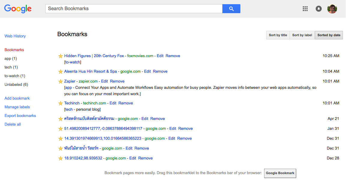 Хотите самое простое приложение для работы с закладками? Просто откройте сайт bookmarks.google.com, чтобы получить обычный текстовый список закладок в вашем браузере. В Google Закладки, скорее всего, уже есть некоторые закладки, даже если вы никогда не пользовались им раньше, поскольку он показывает ваши отмеченные места на Google Maps, а также историю поиска Google и YouTube. Затем вы можете добавить новые закладки с метками и описанием или добавить букмарклет в панель “Избранное”, чтобы быстро добавлять закладки из любого места. Это самое простое приложение для закладок.