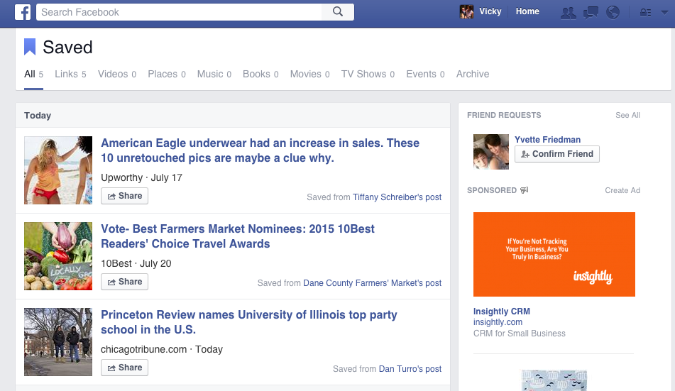 В Facebook есть собственное приложение “Читать позже” или “Закладки”. Когда вы читаете свою ленту Facebook, нажмите на стрелку вниз в правом верхнем углу сообщения и выберите “Сохранить ссылку”. Затем перейдите на сайт facebook.com/saved или найдите опцию “Сохраненные” в меню приложения Facebook, чтобы просмотреть сохраненные ссылки. Вы можете читать, смотреть и, конечно, делиться контентом с друзьями. Они останутся в вашем списке сохраненных материалов. Это отличный вариант, если вы находите большинство материалов в ленте новостей или просто хотите сохранить видео, чтобы найти его позже.