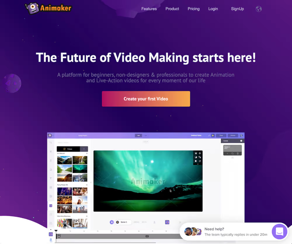 Animatron – это отличный онлайн-аниматор, позволяющий с легкостью выполнять несколько функций. Если вы хотите создать видеоролик, анимацию для доски, потрясающие презентации или даже HTML5-анимацию, вы можете сделать все это с помощью Animatron. Это отличный инструмент для предприятий и стартапов, художников и аниматоров, преподавателей или всех, кто заинтересован в создании анимированных видео. Тысячи бесплатных ресурсов, таких как фоны, реквизит и предварительно анимированные персонажи, облегчат вам процесс создания видео. Вы можете создать целую сцену в течение нескольких минут благодаря инфографике, иконкам и анимированным темам, доступным на рынке Animatron. Вы можете быстро импортировать свои собственные фотографии, видео и графику, добавив анимированный текст, персонажей, аннотации или даже наложив их на медиа. Он позволяет полностью настроить каждый актив, от базовых форм до полностью анимированных персонажей. С помощью Animatron вы можете настроить все в соответствии с вашими требованиями. Кроме того, вы можете загрузить и экспортировать созданное объясняющее видео в любой желаемый формат и поделиться им непосредственно на всех платформах социальных сетей.