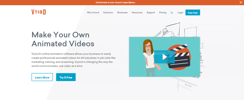 Ранее компания Vyond была известна как GoAnimate. Это облачный инструмент для создания видео, который помогает создавать впечатляющие анимированные видеоролики для всех отраслей. Самое лучшее в Vyond то, что вы можете создавать отличные объясняющие видео с различными стилями анимации, такими как анимация на доске, видеоинфографика и даже бизнес-анимация. Вы можете познакомиться с созданием видео, даже если у вас нет никаких знаний о дизайне. Благодаря оптимизированному потоку и сотням готовых шаблонов, медиа-активов, концепций и элементам управления drag-and-drop, вы найдете его довольно простым в использовании. Когда дело доходит до анимации и персонажей, этот инструмент может стать вашим незаменимым помощником. Вы можете полностью настроить имеющихся в программе персонажей, начиная от цвета кожи и заканчивая выражением лица. Настройки типа тела в этом инструменте пока недоступны. Каждый элемент может быть анимирован для создания лучших анимационных объясняющих видео. Вы можете непосредственно настраивать каждый реквизит или персонаж из самой сцены с помощью функции временной шкалы в нижней части экрана. Для создания богатого анимационного опыта в вашем объясняющем видео вы также можете установить дополнительные камеры для каждой сцены. Шаблоны, доступные в Vyond, можно использовать не только для объяснительных видео, но и для создания удивительных образовательных и информационных видеороликов.