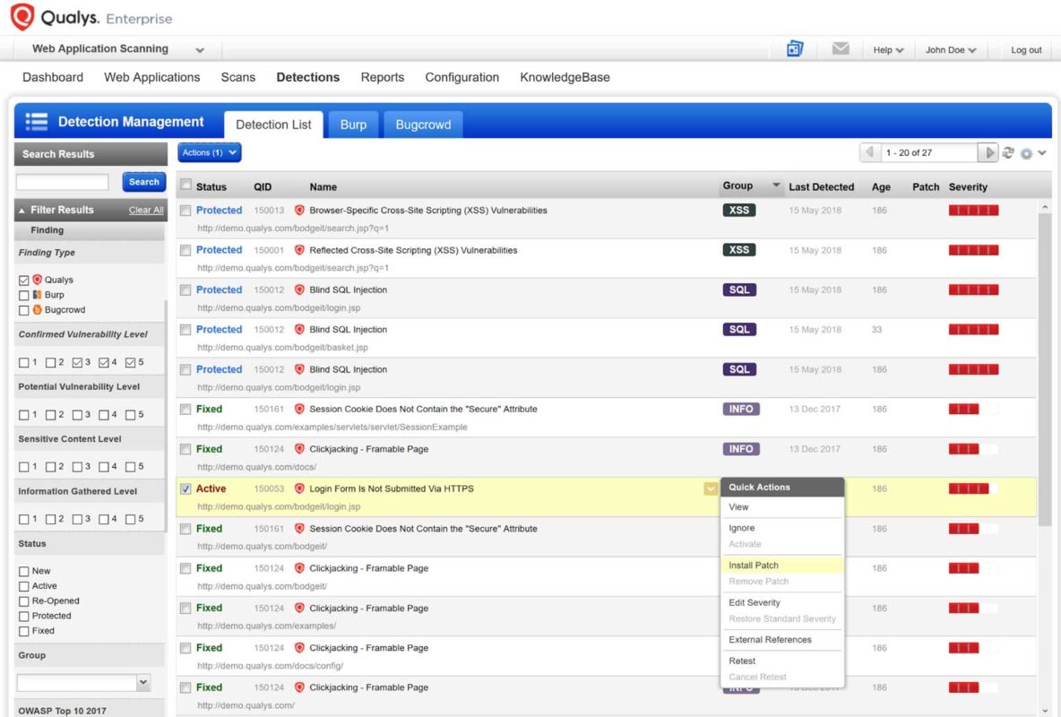 Qualys WAF также интегрирован с решениями для сканирования веб-приложений, что позволяет находить уязвимости и устранять их, останавливая атаки.