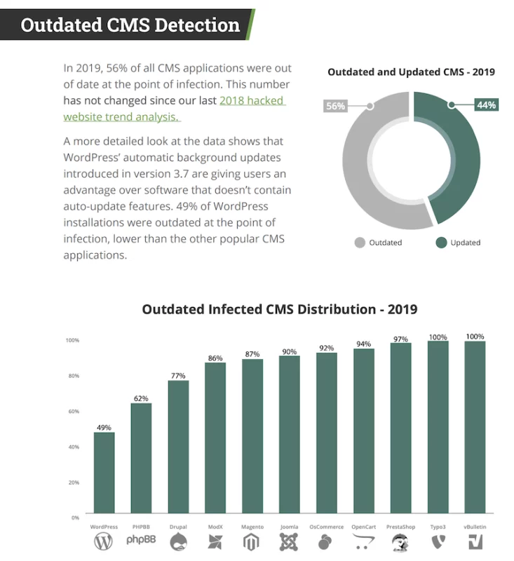 Интересный отчет компании Symantec показывает, что 1 из 10 веб-сайтов содержит один или несколько вредоносных кодов. А если вы используете WordPress, то, согласно другому отчету SUCURI, 49% просканированных сайтов оказались устаревшими.