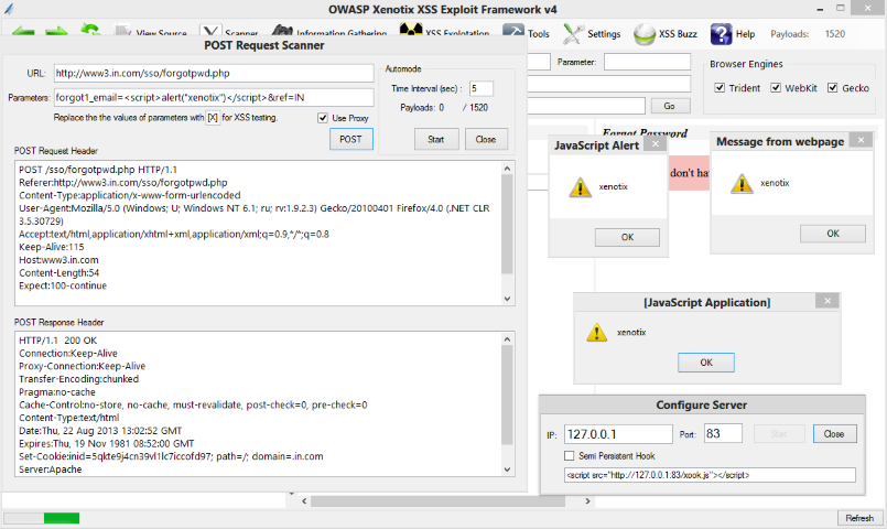 Xenotix XSS от OWASP – это продвинутый фреймворк для поиска и эксплуатации межсайтового скриптинга. В него встроены три интеллектуальных фаззера для быстрого сканирования и улучшения результатов.