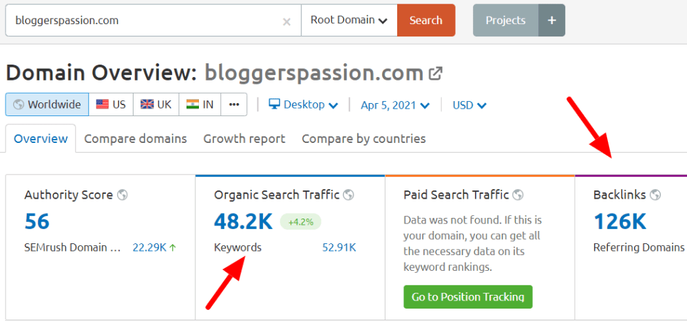 Как вы можете видеть выше, как только вы вводите ЛЮБОЙ домен в инструмент “Обзор домена” на Semrush, он мгновенно показывает вам самые важные данные, включая;
