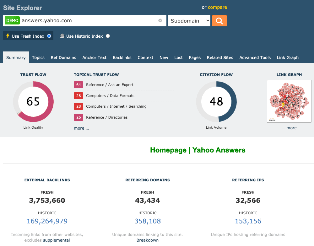 Как вы можете видеть выше, инструмент Site Explorer от Majestic предоставляет вам важные данные, включая;