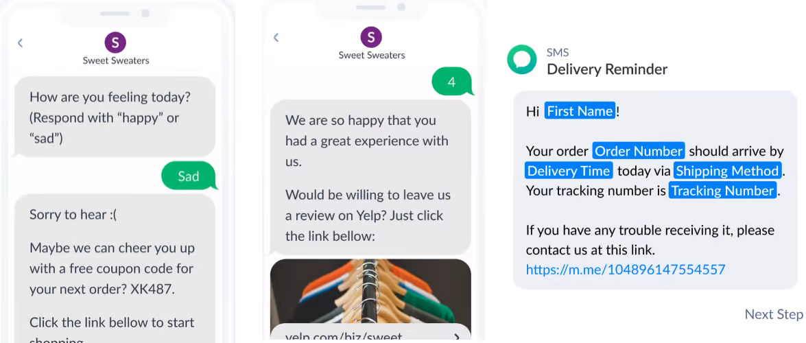 Отправляйте тексты с помощью Drip и увеличивайте прибыль благодаря динамичным и персонализированным рекомендациям продуктов в нужное время. С помощью простого конструктора рабочих процессов Drip вы можете автоматизировать процессы для достижения лучшего результата. Вы также можете установить связь с вашими пользователями/клиентами с помощью SMS, которые мгновенны, просты в употреблении и в точку. Это идеальный канал для установления глубокой связи с ними, отправки ценных сообщений и получения прибыли. Большинство клиентов предпочитают SMS, а не электронные письма и телефонные звонки, поэтому используйте простую форму Drip, чтобы добавить лучших пользователей в свой список. Хотя многим клиентам нравятся текстовые сообщения, они больше любят их с какими-либо промо-акциями или кодами скидок. Благодаря преимуществам SMS-маркетинга вы можете связаться со своим клиентом, где бы он ни находился, с помощью простых кликов. Используйте SMS для привлечения внимания, повышения лояльности пользователей и срочности, отправляя праздничные акции, презентации продуктов, предложения, чувствительные ко времени, VIP-акции и многое другое. Людям не нравятся длинные и спамовые сообщения; чтобы привлечь больше клиентов, делайте текст простым, коротким и понятным. Вы также можете добавить дату и время доставки и автоматизировать рабочий процесс, чтобы не пропустить ни одного клиента. Начните бесплатную пробную версию на 14 дней или выберите тарифный план в зависимости от количества клиентов, начиная с $7,50 за 500 отправлений.