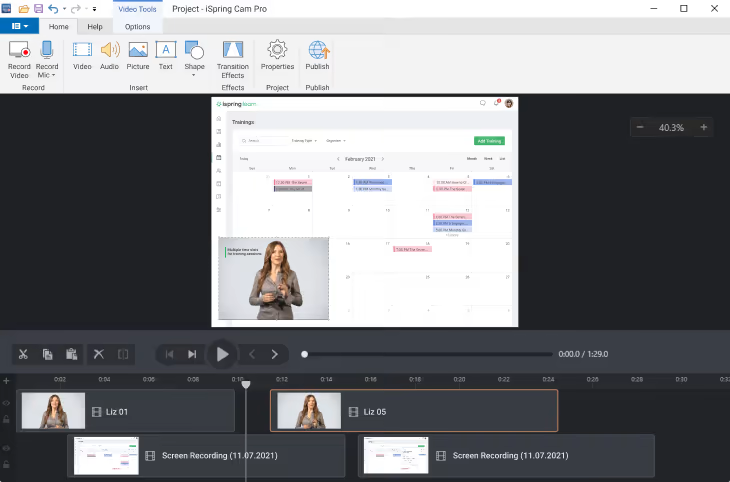 iSpring Cam Pro – это профессиональное программное обеспечение для записи экрана для Windows. Она широко используется различными аудиториями: от корпоративных экспертов до блогеров YouTube. Благодаря широкому спектру возможностей iSpring Cam Pro идеально подходит для создания обучающих программ, видеороликов и целых видеокурсов. Этот инструмент позволяет записывать закадровый голос с помощью микрофона и добавлять в видео звуковые эффекты или музыку. Вы также можете одновременно записывать скринкаст и видео ведущего для создания скринкаста “картинка в картинке”. Чтобы ваши видео выглядели еще более профессионально и увлекательно, вы можете добавить вступительные слайды, титры, аннотации, подсветить действия мыши, выделив курсор и добавив звуки щелчка, а также применить эффекты перехода. После завершения видеозаписи вы можете быстро поделиться ею с аудиторией, загрузив ее непосредственно на YouTube или сохранив в виде файла MP4 на своем компьютере и отправив видео коллегам через LMS или по электронной почте. iSpring Cam Pro имеет бесплатную 14-дневную пробную версию и стоит $227 USD за пользователя/год.