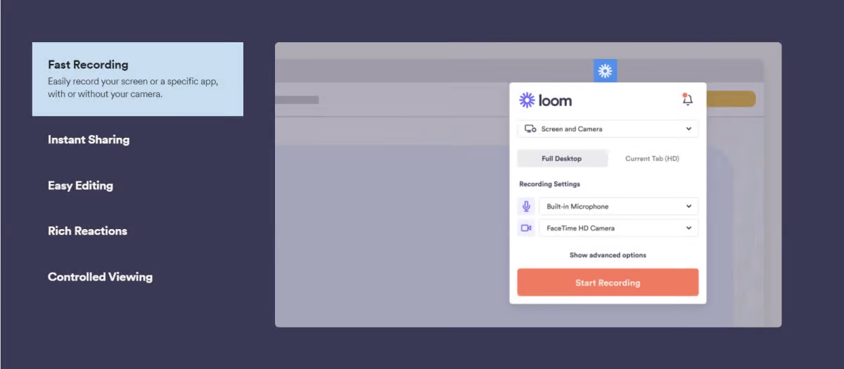 Loom – это простой, бесплатный и удобный в использовании инструмент, который делает запись экрана легким делом. Он не только доступен для различных платформ, но и быстро устанавливается и начинает работать. Более 7 миллионов пользователей из 90 тысяч компаний по всему миру выбрали Loom в качестве программы записи экрана. Он обеспечивает быструю запись, позволяя записывать экран непосредственно с помощью камеры или без нее. Как только вы закончите запись и нажмете кнопку “Стоп”, вы увидите ссылку, которую можно мгновенно скопировать в буфер обмена и тут же поделиться ею. Обрезайте видео и добавляйте на него пользовательскую миниатюру или призыв к действию, чтобы повысить вовлеченность людей, которые могут ожидать от видео и предпринять соответствующие действия. Еще одна интересная функция, включенная в Loom, – реакции, с помощью которых зрители могут легко выражать свое мнение с помощью комментариев и эмодзи. Вы можете контролировать просмотр видео, сделав его доступным только для определенных адресов электронной почты. Для этого вы можете установить пароль для своих видео. В разделе “Контроль доступа” вы увидите опцию “Индексирование поисковыми системами”, включите или выключите ее в зависимости от того, хотите ли вы, чтобы видео было видно всем в Интернете или нет.