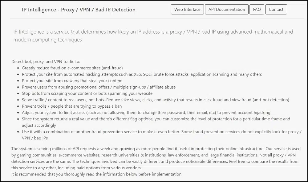 Используя полученные данные, он с помощью собственных методов определяет, является ли IP-адрес прокси, VPN или TOR. В соответствии с рекомендациями, рекомендуется использовать этот сервис только для некритичных приложений, поскольку он неэффективен для выявления мобильных и домашних прокси. Он работает только для прокси-серверов ЦОД и бесплатных прокси/VPN.