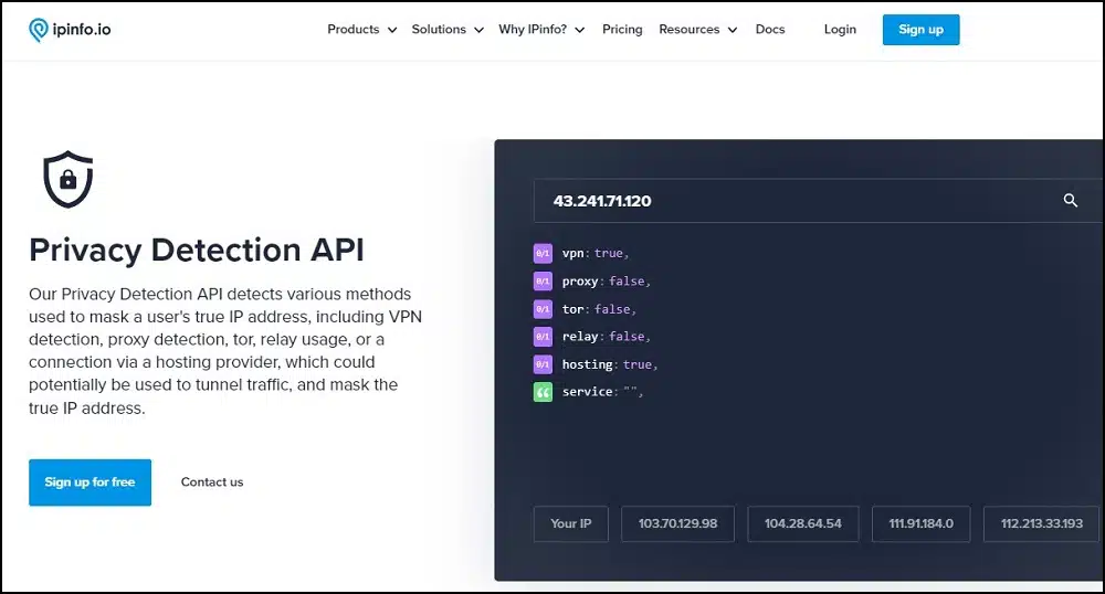 Инструмент IPInfo.io – это популярный инструмент для поиска IP-адресов и получения информации о них. Хотя это можно делать через веб-интерфейс, он также имеет API и позволяет загружать базы данных IP-адресов. Основное внимание здесь уделяется API для обнаружения конфиденциальности. С его помощью можно узнать, не скрывается ли пользователь IP за какими-либо методами маскировки. Это позволяет получить подробную информацию о том, является ли IP прокси-сервером, VPN или узлом TOR.