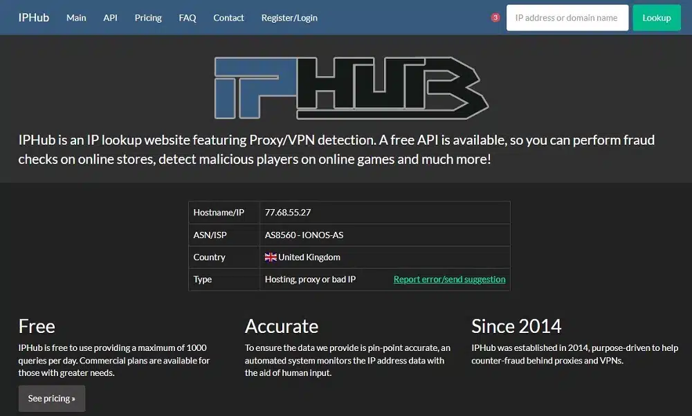 Вы ищете бесплатный инструмент для проверки того, является ли IP-адрес прокси-сервером или VPN? Тогда вам подойдет сервис IPHub, особенно если он нужен для некритичных приложений. С помощью этого сервиса можно бесплатно отправлять до 1000 запросов в день. Это делает его идеальным для сайтов, которые не получают более 1000 запросов или пользователей. Он не очень хорош для обнаружения сложных технологий сокрытия IP-адресов, поэтому знайте, что более умные ребята обойдут эту систему. Поэтому ее следует использовать только в некритичных случаях. Если вам необходимо отправлять больше запросов в день, сервис предлагает коммерческие тарифные планы, и цены на эти пакеты одинаково дешевы.