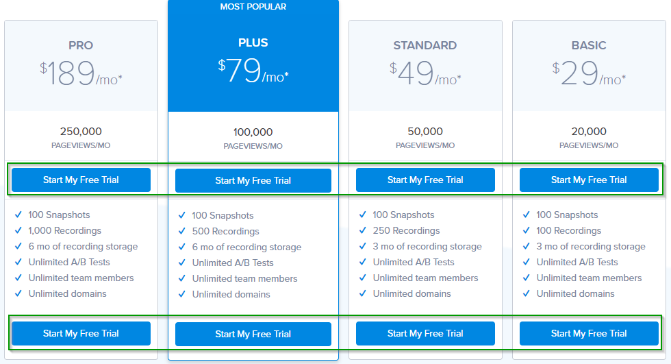 Если вы посетите страницу с ценами Crazy Egg, вы увидите один конкретный призыв к действию, повторяющийся на каждой ценовой линейке:
