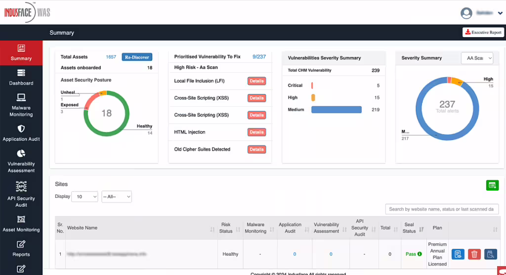 Indusface Web Application Security – это веб-сканер, способный обнаруживать и предоставлять подробную информацию о средних, высоких и критических уязвимостях. Он может сканировать сложные рабочие процессы и выдавать точные результаты с минимальным количеством ложных срабатываний или вообще без них. Indusface Web Application Security поставляется с расширенной функцией обнаружения активов, которая обеспечивает инвентаризацию всех центров обработки данных, мобильных приложений, IP-адресов, доменов, поддоменов и других общедоступных активов.