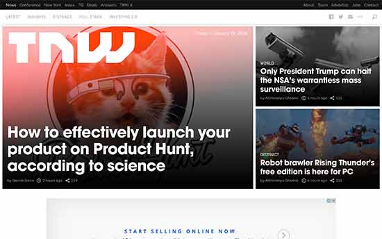 The Next Web – ведущий онлайн-журнал, освещающий такие темы, как технологии, наука, интернет и многое другое. Его главная страница имеет журнальный макет с главными статьями в верхней части, за которыми следуют последние статьи, последние сообщения по категориям и пользовательские разделы, такие как предложения.