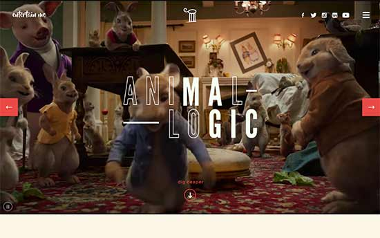 Animal Logic – одна из ведущих мировых творческих цифровых студий. На их домашней странице сверху расположен красивый видеослайдер, демонстрирующий их работы, показанные в лучших голливудских фильмах. За слайдером следуют различные разделы, каждый из которых отображается с помощью красивой CSS-анимации.