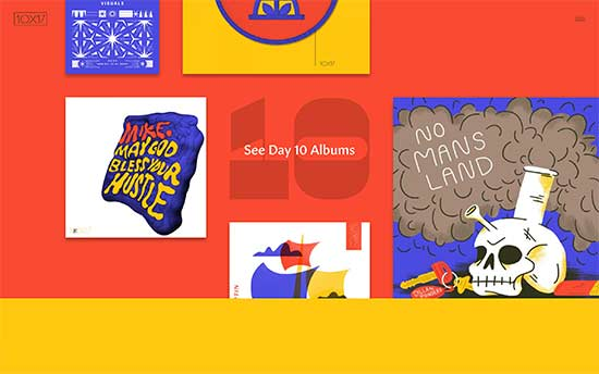 10×17 – это проект 26 художников, которые визуально интерпретируют и ведут обратный отсчет своих любимых альбомов 2017 года. На сайте представлены работы художников и аудио-треки из выбранных ими альбомов. Общий дизайн очень красочный, увлекательный и интерактивный.