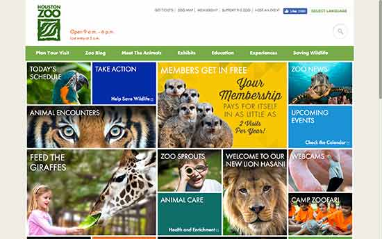 Веб-сайт Хьюстонского зоопарка прост и информативен. На нем есть логотип, часы работы и навигационное меню в верхней части. Область содержимого главной страницы представляет собой плитку в виде кладочной сетки с кнопкой “Загрузить больше” внизу.