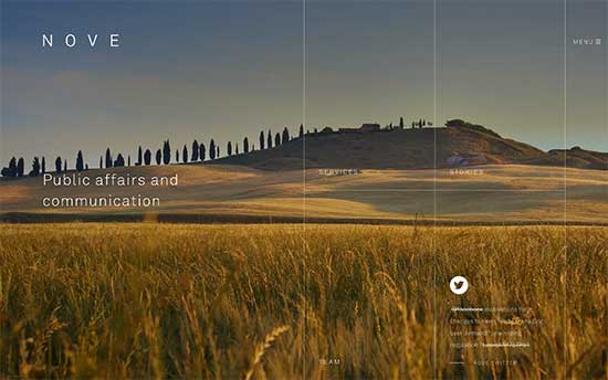 Nove – это консультационное агентство, которое помогает бизнесу взаимодействовать с европейскими институтами. Их сайт имеет уникальный дизайн с полноэкранным видеофоном, прозрачным меню и индивидуальными шаблонами страниц для различных разделов.