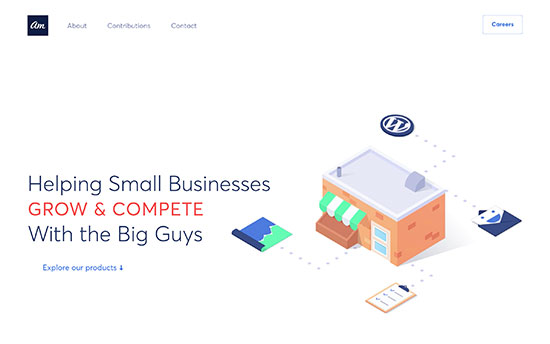 Awesome Motive является материнской компанией WPBeginner. Новый дизайн сайта нашей компании прост и элегантен, в заголовке присутствует тонкая анимация, а в качестве приветственного сообщения – миссия компании. Ниже показаны основные статистические данные, наша продукция, вакансии и многое другое.