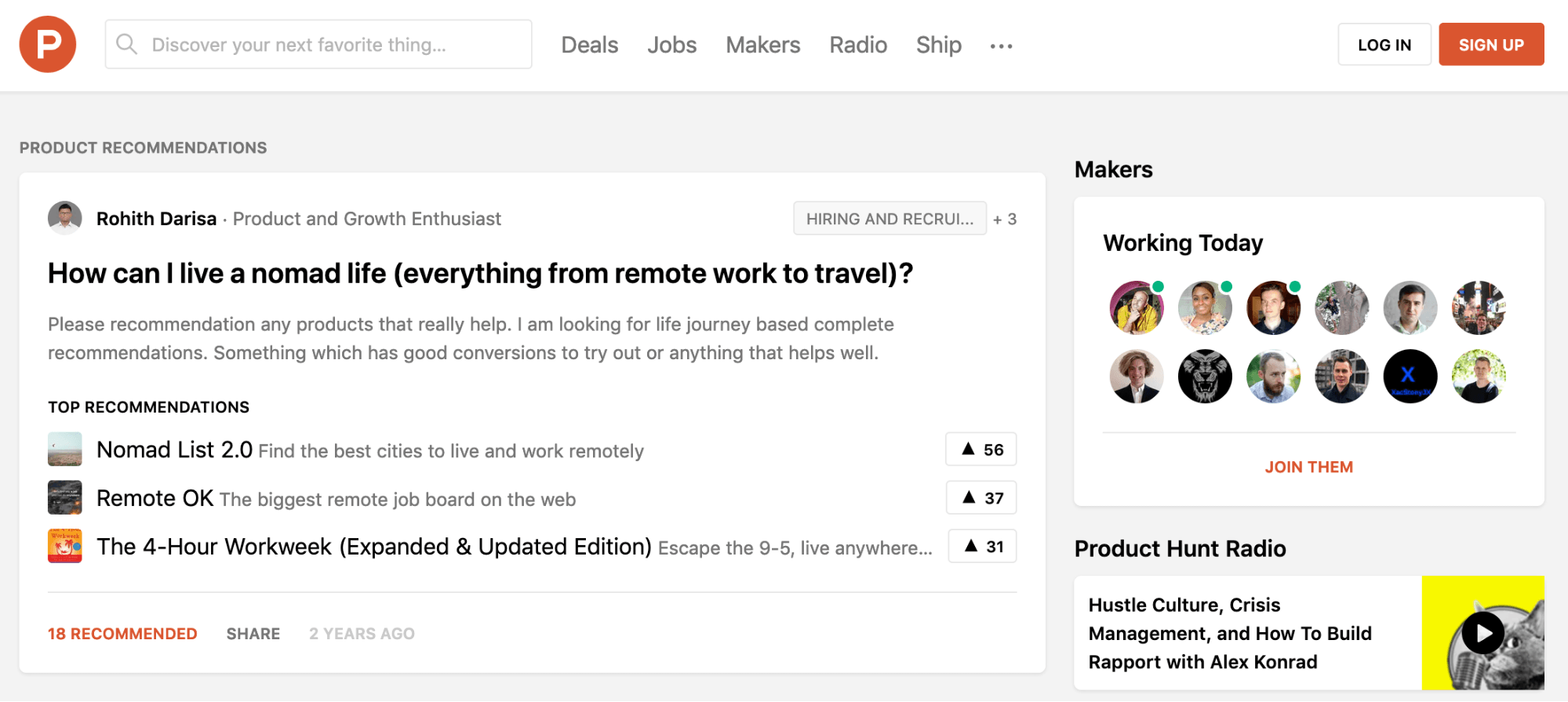 Product Hunt – это сайт, который помогает пользователям делиться новыми товарами и открывать их для себя. Бренд Startup Drugz использовал Product Hunt, чтобы привлечь 35 000 уникальных посетителей в свой интернет-магазин. Вот как это работает: Создайте учетную запись, подождите неделю, чтобы получить права на публикацию, а затем разместите свой товар. Не забывайте использовать высококачественные фотографии товара, добавлять хорошо написанные описания и использовать параметры URL, чтобы можно было отслеживать приходящий трафик.