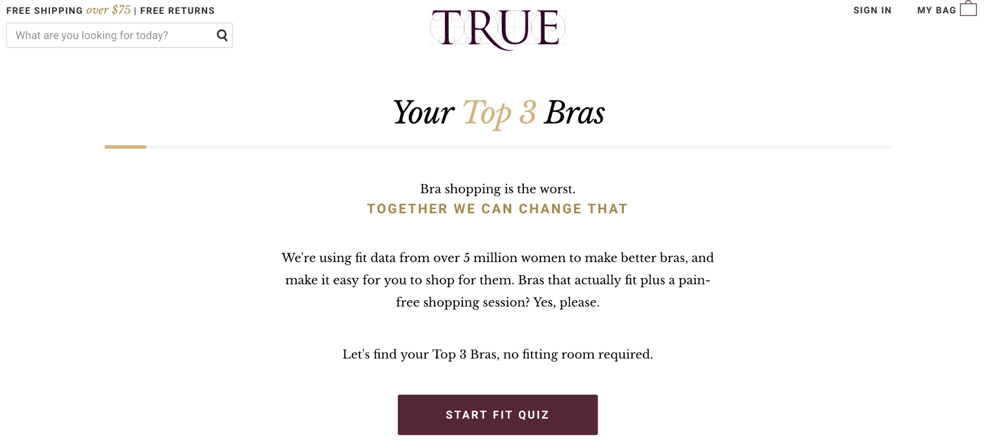 Викторины – это эффективный инструмент генерации лидов, который следует использовать в комплексе контент-маркетинга. В 2016 году коэффициент конверсии пользователей LeadQuizzes составил 33,6%. И это не только электронные письма пользователей, на которые вы можете ориентироваться в будущем, у вас также есть данные о них через их ответы на вопросы викторины. Но давайте вернемся к главной цели: посещаемости сайта. Когда пользователи заканчивают викторину, они получают результаты, которыми можно поделиться. Затем они публикуют эти результаты в социальных сетях, и их знакомые могут перейти по ссылке и пройти тест самостоятельно. Используйте эту тактику для увеличения трафика и одновременного расширения списка адресов электронной почты. Компания по производству бюстгальтеров True & Co. проводит на своем сайте викторину, чтобы помочь пользователям выбрать бюстгальтер нужного размера. На основании ответов пользователей они дают им рекомендации по товарам.