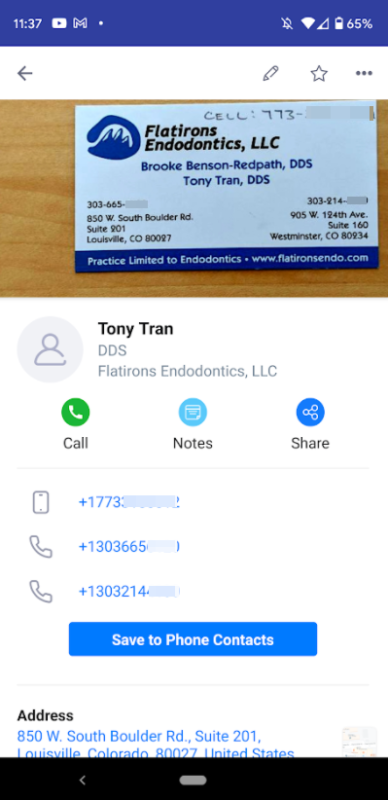 Сканирование визитных карточек требуется лишь изредка? Возможно, вам не нужно специальное приложение для сканирования визиток. Вместо этого вы можете использовать инструменты сканера, встроенные в уже используемое вами приложение, для захвата визиток и копирования текста, а затем вручную сохранить контакты в адресной книге.