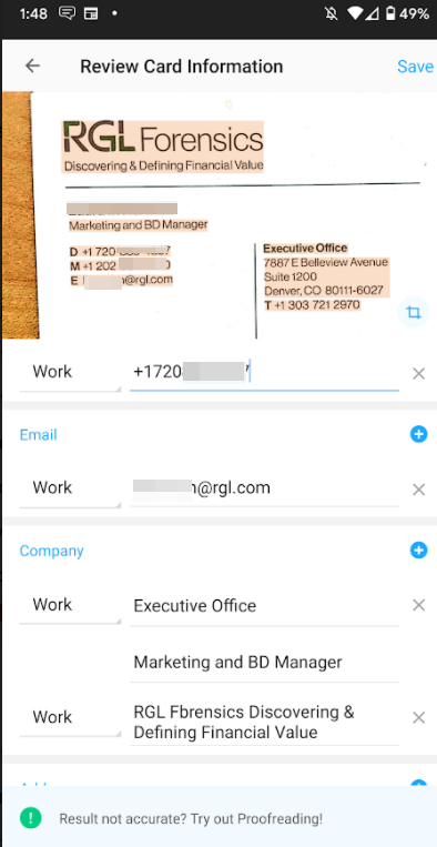 CamCard делает процесс сканирования, проверки и управления визитными карточками проще, чем любое другое протестированное приложение. Оно также обеспечивает точность выше среднего и предоставляет услуги человеческой транскрипции. После того как вы сфотографируете визитку (индивидуальную или пакетную), ее изображение появится в верхней части записи. Вся информация о карте выделена красным цветом, чтобы ее было легче проверить. Если необходимо внести правку, просто нажмите на поле (телефон, адрес и т.д.) – теперь оно выделено на изображении карты – и внесите исправления. В самом низу есть кнопка для добавления поля, если это необходимо. А если вы предпочитаете, чтобы расшифровкой занимался человек, нажмите кнопку Proofread внизу. После сохранения у вас будет возможность добавить контакт в группу, установить напоминание, экспортировать в Excel или поделиться им. Варианты обмена включают SMS, Facebook, Twitter, LinkedIn, в виде QR-кода и другие каналы.