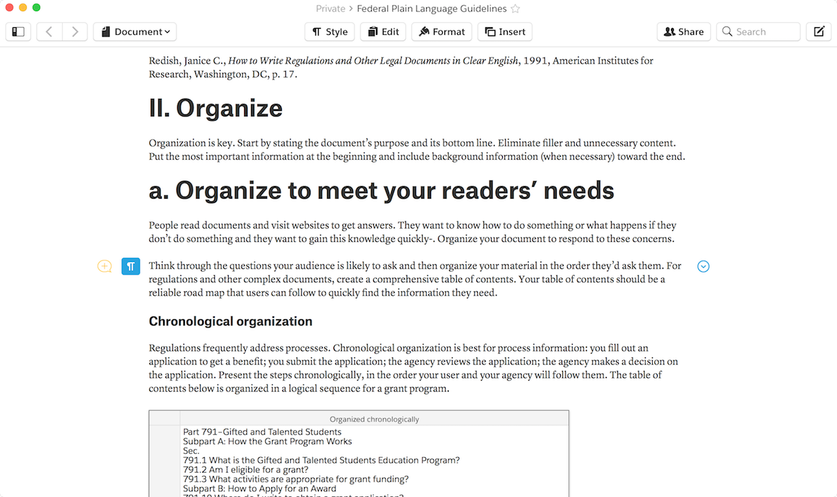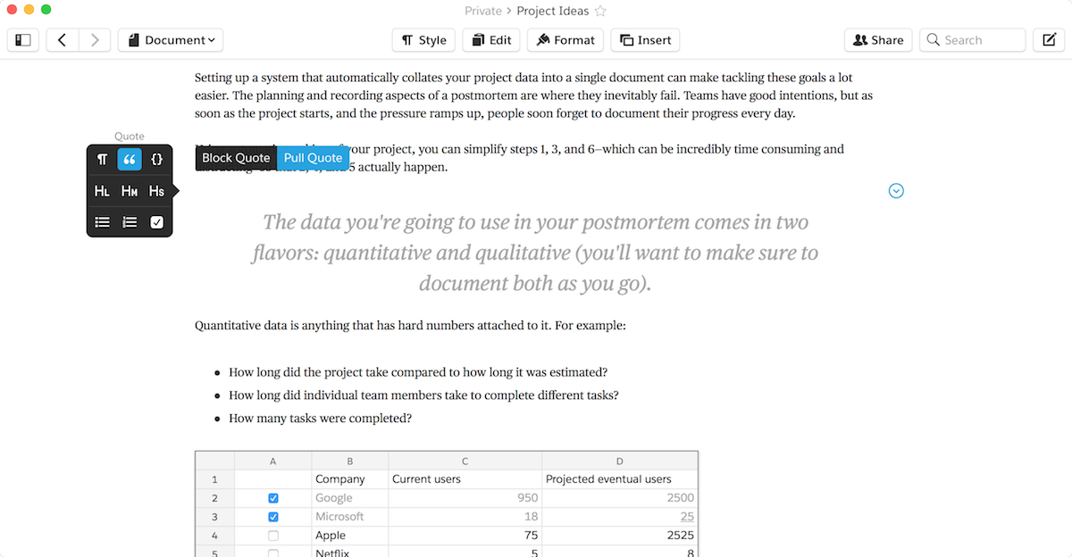 Компания Quip решила переосмыслить офисное программное обеспечение. Идея документов все еще коренится в бумаге – в большинстве текстовых процессоров вы работаете на виртуальном листе бумаги формата А4, хотя вы можете и не распечатывать готовый документ. Quip избавляется от этого скеоморфизма. Подобно веб-странице, ваши документы Quip будут длиться вечно, без разрыва страницы или колонтитула. Пишите и организуйте текст с помощью заголовков в веб-стиле. Используйте стандартные сочетания клавиш для форматирования текста – наведите курсор на левую часть абзаца, чтобы превратить его в цитату, блок кода, заголовок или список. Справа добавьте в документ новые разделы – ссылки на другие документы, “умные” даты, напоминающие о сроках, и упоминания, чтобы привлечь других людей к вашему документу. Это живые документы, умные страницы, содержащие все, над чем вы работаете – то, что никогда не поместится на печатном листе.