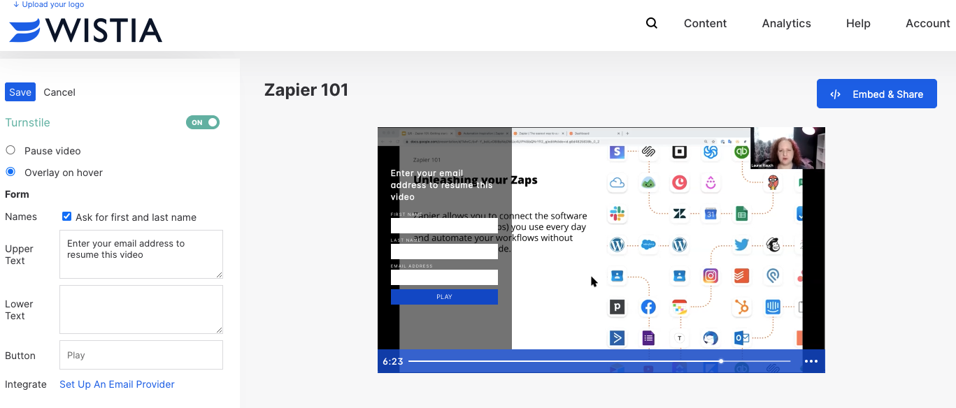 Wistia оснащена маркетинговыми функциями, которые помогают компаниям отслеживать продвижение видео, собирать потенциальных клиентов и получать максимальную рентабельность инвестиций в свой контент. Одной из главных функций Wistia является сборщик писем “Турникет”, который помогает вам генерировать лиды. Вот как это работает: Выберите Turnstile на панели Customize и выберите, хотите ли вы, чтобы форма отображалась на весь экран, во время паузы видео, или накладывалась при наведении. Вы можете добавить форму в любой момент вашего видео и настроить текст (однако вы не можете изменить поля формы). Как только зритель введет свои данные, он будет добавлен в ваш список адресов электронной почты с помощью интеграций Wistia для маркетинга электронной почты, включая такие платформы, как Campaign Monitor, Mailchimp и Constant Contact. Если вы не хотите добавлять турникет к своим видео, Wistia все равно предлагает мощные маркетинговые функции. Вы можете использовать аннотационные ссылки, чтобы направить зрителей на выбранный вами сайт. Эти ссылки появляются в правом верхнем углу вашего видео на любое время, не нарушая впечатления зрителя. В конце видео можно также добавить призыв к действию или ссылку на другое видео или веб-страницу. И все это вместе – на странице “Статистика”, которая позволит вам оценить эффективность каждого из ваших видео: каждое действие зрителя, будь то переход по ссылке или заполнение формы, фиксируется на этой странице. Ценообразование Wistia: Бесплатно для трех видео и стандартных функций, таких как полностью настраиваемый плеер, инструменты для привлечения потенциальных пользователей, видеоаналитика и неограниченное количество пользователей; от $99 в месяц за тарифный план Pro, включающий стандартные функции, десять бесплатных видео и отсутствие брендинга Wistia.