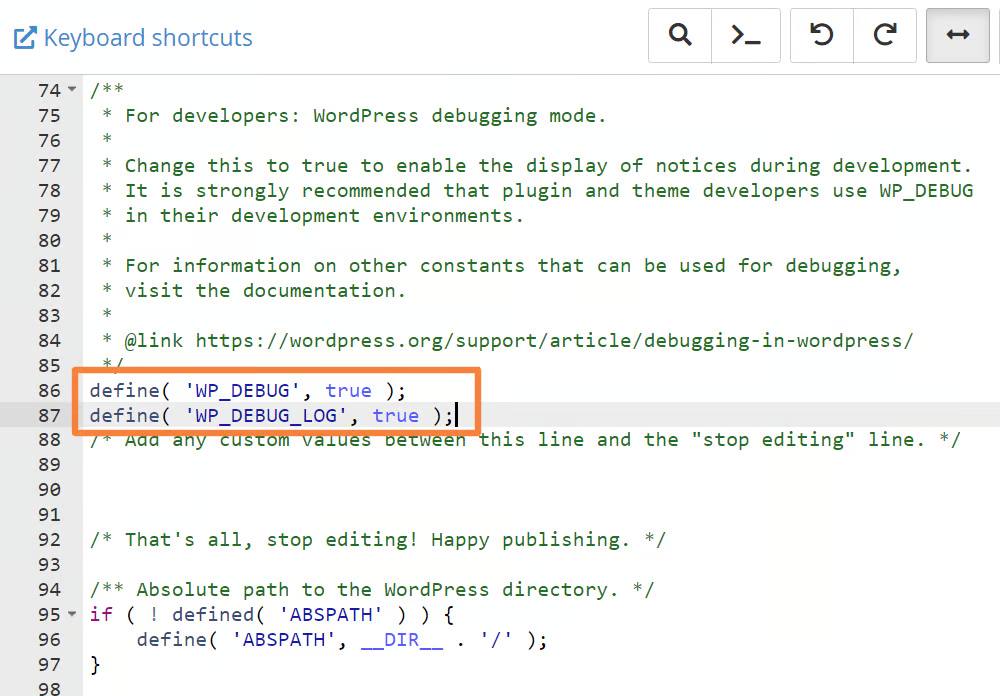 - Если строка define( ‘WP_DEBUG’, true ); уже существует в файле, убедитесь, что она читается как true. В этом случае достаточно добавить вторую строку кода define( ‘WP_DEBUG_LOG’, true );, чтобы включить регистрацию ошибок.