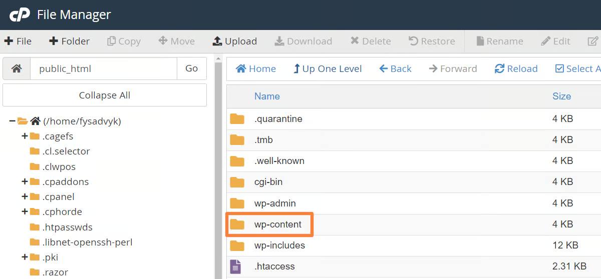 - После добавления кода сохраните изменения в файле wp-config.php и перезагрузите страницу, на которой была обнаружена ошибка 422. После этого перейдите в папку wp-content в cPanel.