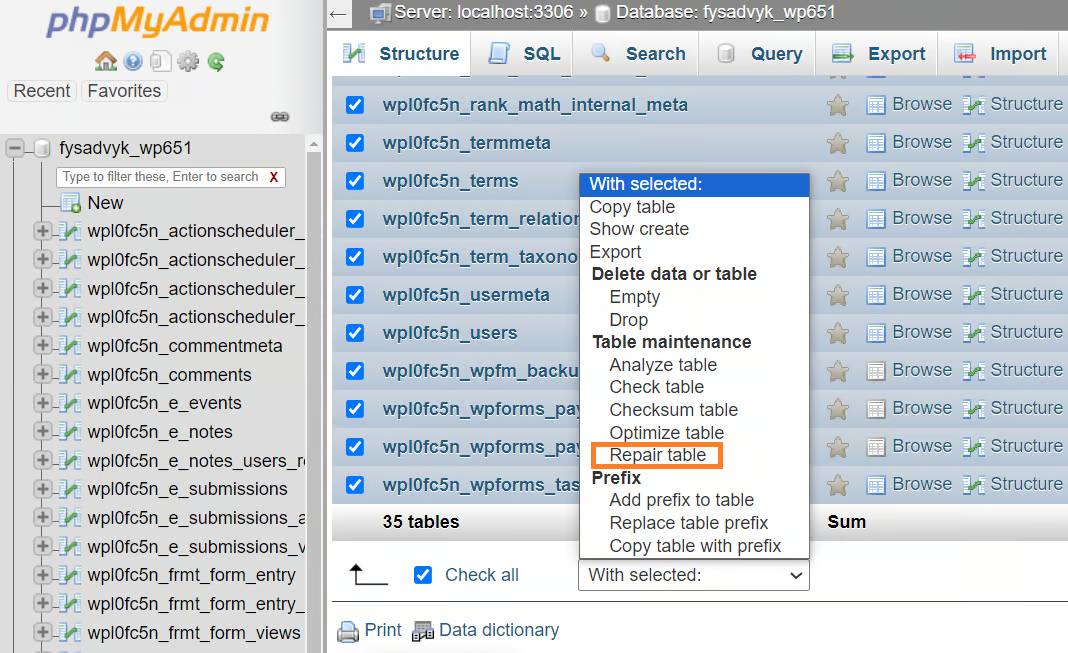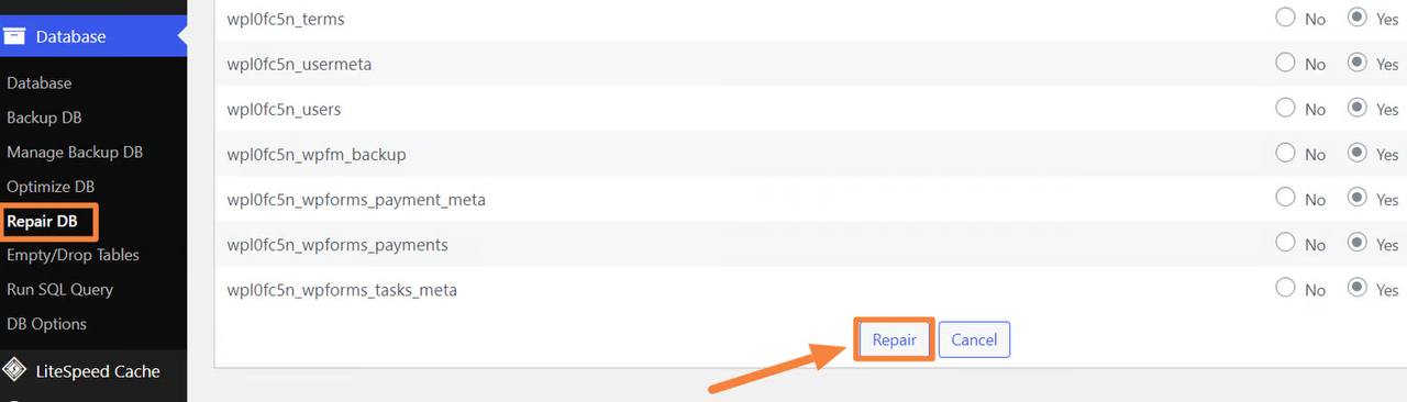 - Теперь вернитесь в панель Dashboard и выберите пункт Database > Repair DB. Выберите таблицы базы данных, которые, как вы уже знаете, повреждены, и нажмите кнопку Repair в нижней части таблиц базы данных.
