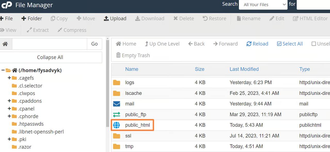 - В диспетчере файлов прокрутите страницу вниз и щелкните на файле public_html.