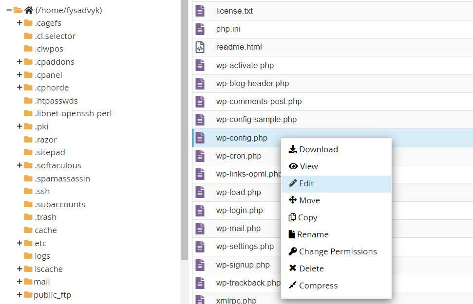 - Теперь щелкните на файле wp-config.php, затем щелкните на нем правой кнопкой мыши и выберите опцию редактирования.