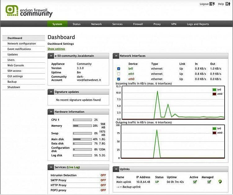 Smoothwall express поддерживает LAN, DMZ, внутренний и внешний сетевой брандмауэр, веб-прокси для ускорения, статистику трафика и т.д. Выключить или перезагрузить устройство можно непосредственно через веб-интерфейс.