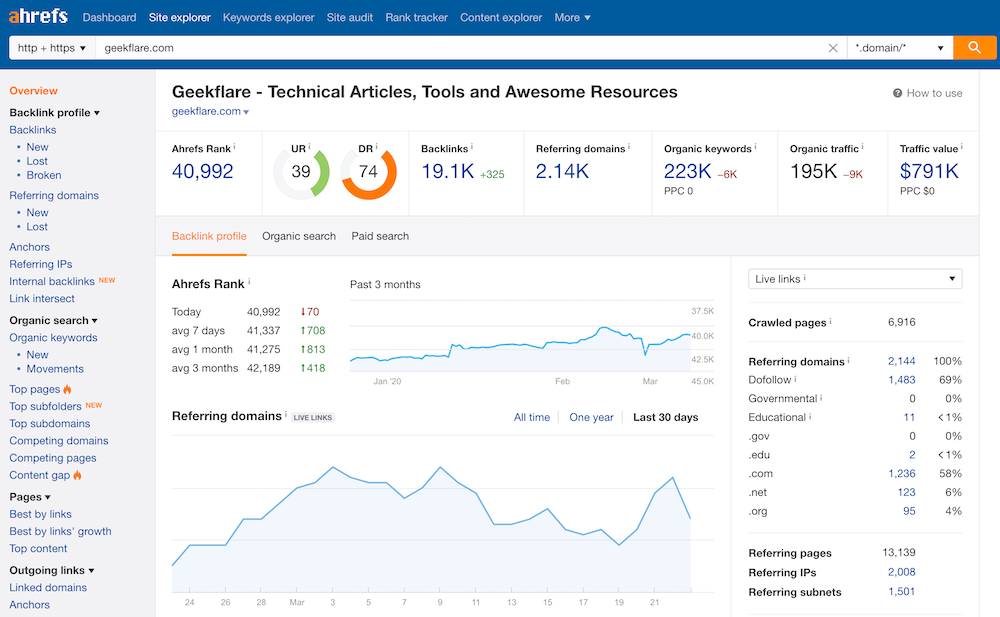 Ahrefs содержит один из крупнейших индексов обратных ссылок во всем мире. Помимо управления обратными ссылками, Ahrefs предназначен для выполнения большинства действий, которые ежедневно приходится делать SEO-профессионалу, хотя он довольно прост в использовании и для непрофессионалов. Но именно в области обратных ссылок Ahrefs предоставляет множество инструментов для исследования обратных ссылок. Например, один из этих инструментов, называемый “Link Intersect”, позволяет обнаружить сайты, которые ссылаются на ваших конкурентов, но не на вас. Это очень полезная информация, потому что если сайт ссылается на более чем одного вашего конкурента, есть большая вероятность, что он может добавить ссылку на ваш сайт. Ahrefs предлагает бесплатную версию, которая позволяет отслеживать десять обратных ссылок и два домена по одному запросу. Если вы готовы заплатить 82 доллара в месяц, вы получите всесторонний анализ вашего профиля обратных ссылок, включая обратные ссылки на изображения, dofollow/nofollow, якорный текст и т.д. Такая информация может оказаться бесценной в случае, если вы получите штраф от Google, поскольку она дает вам данные о соотношении анкорного текста на вашем сайте. Информация, предоставляемая Ahrefs, не только поможет вам в вашей деятельности по построению ссылок. Она также показывает потерянные обратные ссылки и новые обратные ссылки на ваш сайт, чтобы вы могли поблагодарить веб-мастера или отблагодарить его взаимной ссылкой. Что касается потерянных ссылок, то вам будет сообщена причина потери, так что вам не придется гадать, почему это произошло. Приборная панель Ahrefs также показывает подозрительные ссылки, которые вы можете дезавуировать, чтобы избежать штрафов.