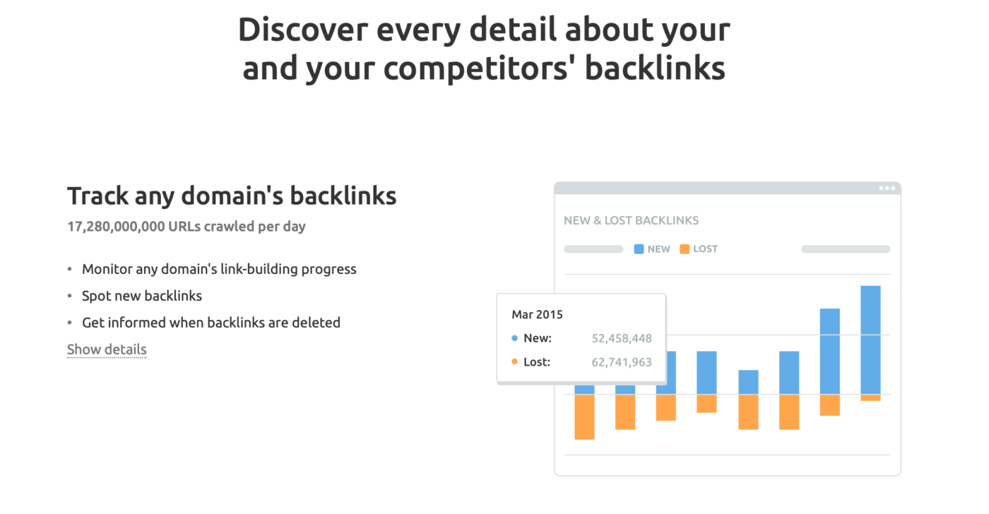 В Semrush вы можете найти инструмент анализа обратных ссылок, мощный инструмент для получения функциональных данных об обратных ссылках с любого домена. Благодаря своей огромной базе данных из 26,5 триллионов обратных ссылок Semrush предлагает множество показательных графиков, демонстрирующих новые и потерянные обратные ссылки, ранги авторитетности всех рефералов, эволюцию процессов генерации обратных ссылок и многое другое. С помощью инструмента Backlink Audit вы можете интегрировать данные Search Console и избежать наказания со стороны Penguin. Вы также можете обнаружить и удалить токсичные обратные ссылки и отправить их в инструмент дезавуирования Google, сохраняя свой профиль обратных ссылок чистым благодаря автоматическому и периодическому отслеживанию. Помимо анализа обратных ссылок, Semrush предлагает полный набор SEO-инструментов, которые вы можете использовать бесплатно, неограниченное время, но с ограниченной функциональностью. Сюда входит исследование ключевых слов, анализ монетизации, анализ трафика, отслеживание позиции в SERP, отображение CPC и многое другое.