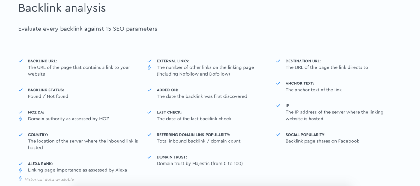 SE Ranking – это программа проверки обратных ссылок, которая использует данные Google Webmaster Tools для проверки входящих ссылок на ваш сайт или сайты ваших конкурентов. Инструмент генерирует подробный анализ ссылок, который показывает атрибуты follow/nofollow, index/no index, cached/not cached, авторитет домена, якорный текст, социальную популярность, рейтинг Alexa и многое другое. Он позволяет дезавуировать ссылки и генерировать файлы для отправки их непосредственно в Google. SE Ranking предлагает три базовых плана: Optimum ($ 39/месяц), Plus ($ 89/месяц) и Enterprise ($ 189/месяц). Они различаются по количеству проверяемых сайтов и количеству отслеживаемых обратных ссылок. Вы можете получить скидки, подписавшись на много месяцев или уменьшив частоту проверок: 20% за проверку каждые три дня и 40%, если вы согласны на еженедельную проверку; в противном случае проверка выполняется ежедневно.