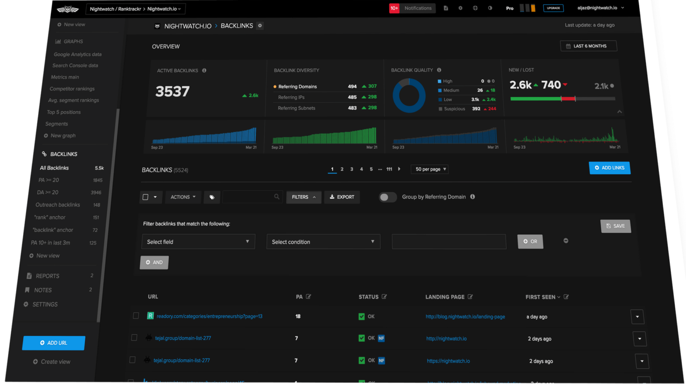 Инструмент мониторинга обратных ссылок, который анализирует истинное влияние ваших обратных ссылок на рейтинг в SERP. С помощью интеллектуальных уведомлений Nightwatch регулярно отправляет вам обновления о новых обнаруженных и потерянных обратных ссылках. Он использует собственные краулеры в сочетании с несколькими внешними источниками отслеживания, чтобы предоставить точную и актуальную информацию обо всех обратных ссылках, которые могут повлиять на ваше ранжирование. Инструменты визуализации предлагают сегментацию по любым параметрам, чтобы помочь понять влияние каждой обратной ссылки. Портфель обратных ссылок обобщает различные сегменты, приобретенные в разное время. Вы можете узнать их разнообразие по качеству, домену, атрибутам follow/no-follow и статусу спама. Nightwatch выполняет автоматическую проверку живых и мертвых ссылок, чтобы показать вам, какие ссылки добавляют ценность вашему сайту, а какие снижают ее.