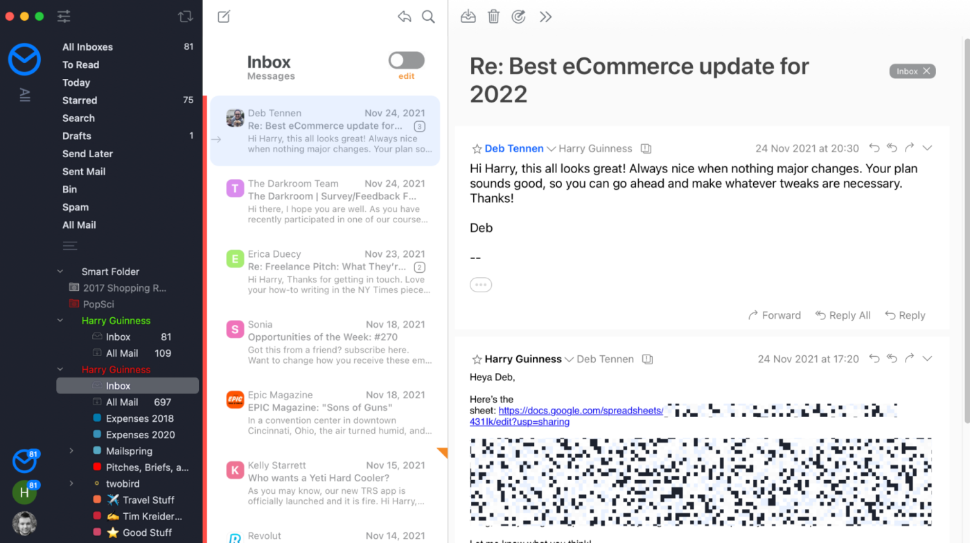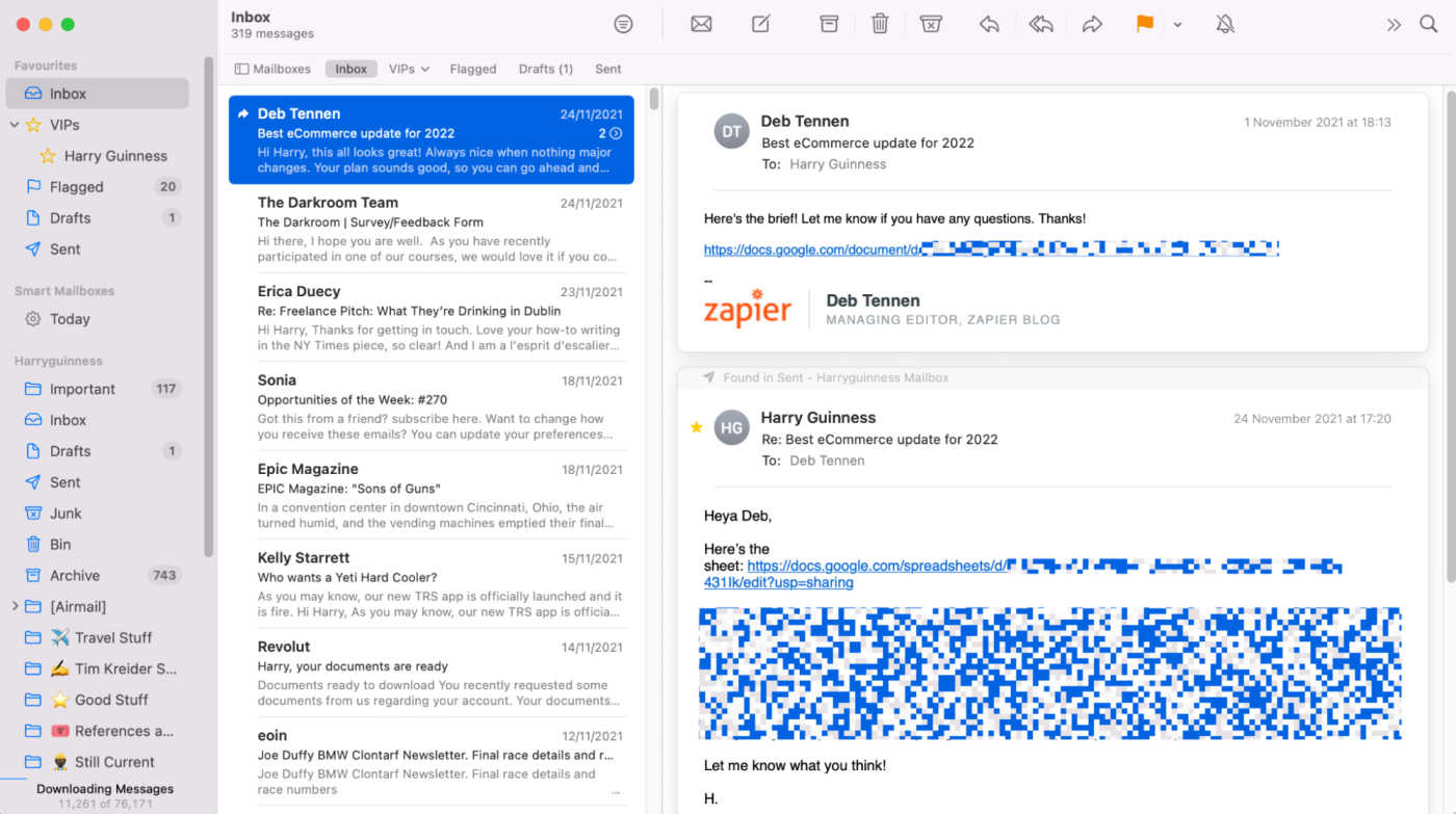 Apple Mail поставляется вместе с macOS, что является достаточной причиной для большинства людей, чтобы попробовать его первым. И, честно говоря, если вы не являетесь ценителем почтовых приложений, вам действительно не нужно пробовать ничего другого. За последние несколько лет Apple обновила приложение, и оно имеет приятный современный пользовательский интерфейс, а также солидный набор функций. Все ваши почтовые ящики, папки и учетные записи доступны на левой боковой панели – как по отдельности, так и в едином почтовом ящике, объединяющем все ваши учетные записи. Письма автоматически группируются в потоковые беседы, разделенные по темам. Мне очень нравится функция “умных” почтовых ящиков, которые фильтруют приходящие письма на основе установленных вами правил. Это то, что не всегда включено в бесплатные приложения. Чтобы создать такой ящик, перейдите в меню “Почтовый ящик” > “Новый интеллектуальный почтовый ящик” и задайте ряд правил, например непрочитанные сообщения от нескольких определенных людей или письма с вложениями, на которые вы еще не ответили. Apple Mail также прекрасно интегрируется с остальной экосистемой Apple. Вы можете отправлять большие файлы с помощью Mail Drop, который загружает их в iCloud для упрощения обмена. С помощью функции Handoff вы можете начать составление письма на Mac, а затем продолжить его в том же месте в приложении Mail на iPhone. Если вы знаете, что вам не нужен какой-то конкретный набор функций, которых не хватает в Mail, это лучшее почтовое приложение для большинства пользователей Mac. Ценообразование в Apple Mail: Бесплатно