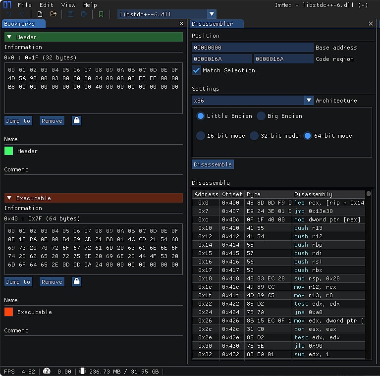 ImHex – это бесплатный шестнадцатеричный редактор с открытым исходным кодом, доступный для Windows и Linux. Он обладает удобным интерфейсом и множеством функций, которые делают его простым в использовании. Среди ключевых особенностей ImHex – поддержка больших файлов, гибкая функция поиска и замены, а также возможность сравнения файлов друг с другом. ImHex также позволяет пользователям определять собственные типы данных, что может быть полезно для изучения конкретных типов данных в файле.