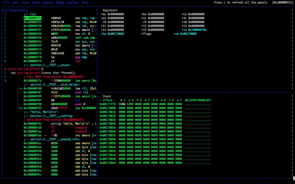 В состав Radare2 также входит дизассемблер, с помощью которого можно преобразовать двоичный код в человекочитаемые инструкции ассемблера, что облегчает понимание внутренней работы двоичного файла. Он предлагает различные возможности для реверс-инжиниринга, включая поддержку различных архитектур и форматов файлов, возможность проведения статического и динамического анализа, а также интеграцию с другими инструментами, такими как отладчики и дизассемблеры.