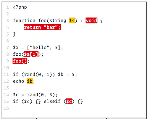 Вы можете попробовать онлайн версию здесь. Для использования PHPStan требуется версия 7.1 или выше и композитор. Однако он способен обнаружить ошибки более старой версии.