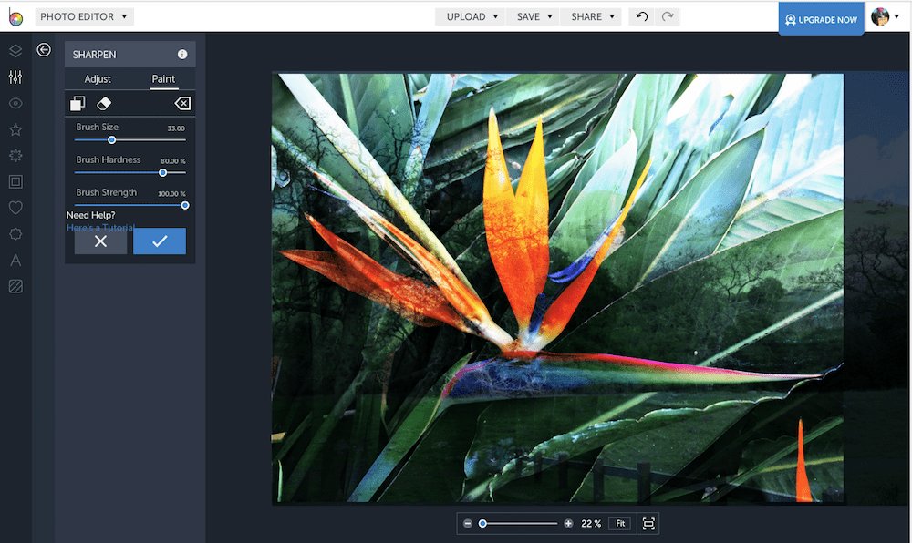 BeFunky известен своими спецэффектами, о чем свидетельствует функция “Менеджер слоев” в верхней части главной панели инструментов. Выпадающее меню, доступное из каждого основного раздела – “Редактирование”, “Ретушь”, “Эффект”, “Художественный”, “Рамки”, “Графика”, “Наложение”, “Текст” и “Текстуры” – позволяет переключаться между фоторедактором, дизайнером и создателем коллажей, в которых есть бесплатные и премиум-элементы, которые можно улучшить с помощью ползунков. Бесплатная версия имеет огромный список элементов и стилей в дополнение к умопомрачительному набору стикеров, шрифтов и фонов. А режим Paint позволяет накладывать эффекты с помощью кисти, а не наносить их равномерно на весь кадр. Вы можете многое сделать с помощью бесплатной версии BeFunky, но если вам понравится то, что вы видите, обновите ее, чтобы получить доступ к расширенным эффектам редактора: HDR DLX, Sharpen DLX, Vibrant Colors DLX и DeNoise DLX – простые в использовании инструменты, которые отличают его от других онлайн-редакторов благодаря использованию обновленных алгоритмов для повышения точности и фотореализма выбранного эффекта или функции. Функция Touch Up предоставляет базовые элементы управления бесплатно, но большинство ее коррекций доступны только в премиум-версии. Раздел Artsy также является частью премиум-версии, но вы можете сначала опробовать все эффекты, чтобы определить, стоит ли оно того. Обновление также удаляет рекламу и позволяет выводить изображения высокого разрешения 4000 x 4000 пикселей.
